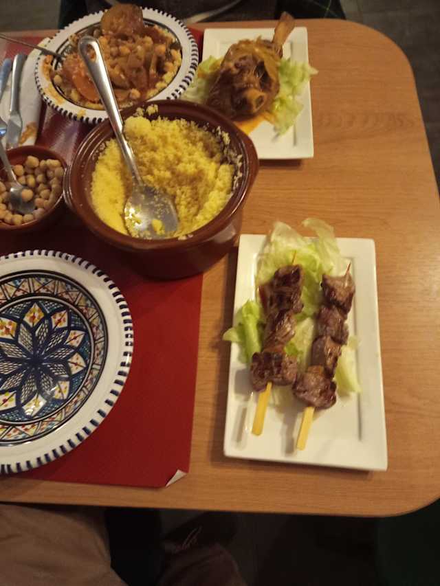 5/10The food looked good but had no taste. We had a lamb tagine with prunes and almonds and a vegetarian couscous. The lamb consisted of huge chunks of meat with a lot of fat and bone. A dog's dinner! Could not taste any spices. The vegetarian couscous was a watery soup with boiled vegetables and no taste. It was Saturday night and we were the only diners in this huge restaurant. Not at all surprising since the quality of food was so bad.