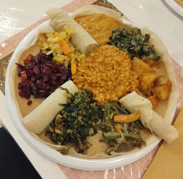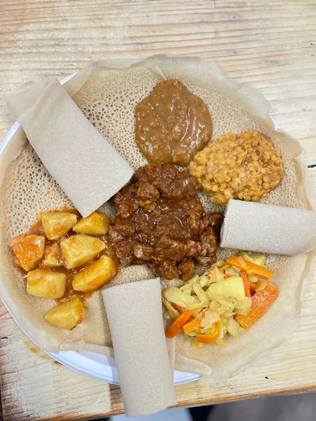 Stufato di agnello in un unico piatto con 4 contorni a scelta, servito con injera.