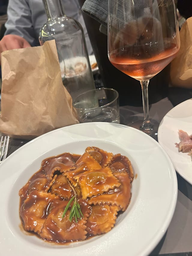 10/10A lovely lunch at Kewinery with my darling wife. Our server/host Michele was terrific throughout — and what tickled me was how he sang along (and occasionally danced) with the music they had playing, of singers like Dalla, Battisti and others artists that mremembered hearing in her teenage years. At this place with a terrific wine list we had a very nice Nebbiolo from Cascina Boschetti. My bride started off with Insalata Russa in the form of a thick disc. I had a plate of wonderful agnolotti filled with three meats and served in a roast sauce. Afterwards my wife had a plate of those agnolotti; I had veal meatballs that I was properly forewarned were piping hot. The terracotta bowl kept them very hot; it was a very tasty dish. For dessert cantucci with Vin Santo. It brought back memories to my wife of when she had worked in Firenze. The meal was great on its own, but the uplifting attitude of Michele made it even more fun. What a difference a light-hearted spirit can make.
