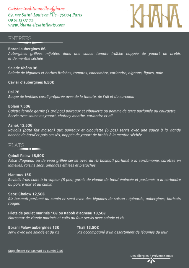 9.5/10Very quiet and nice little restaurant on Ile St Louis with authentic Afghan food and great service. Will return.