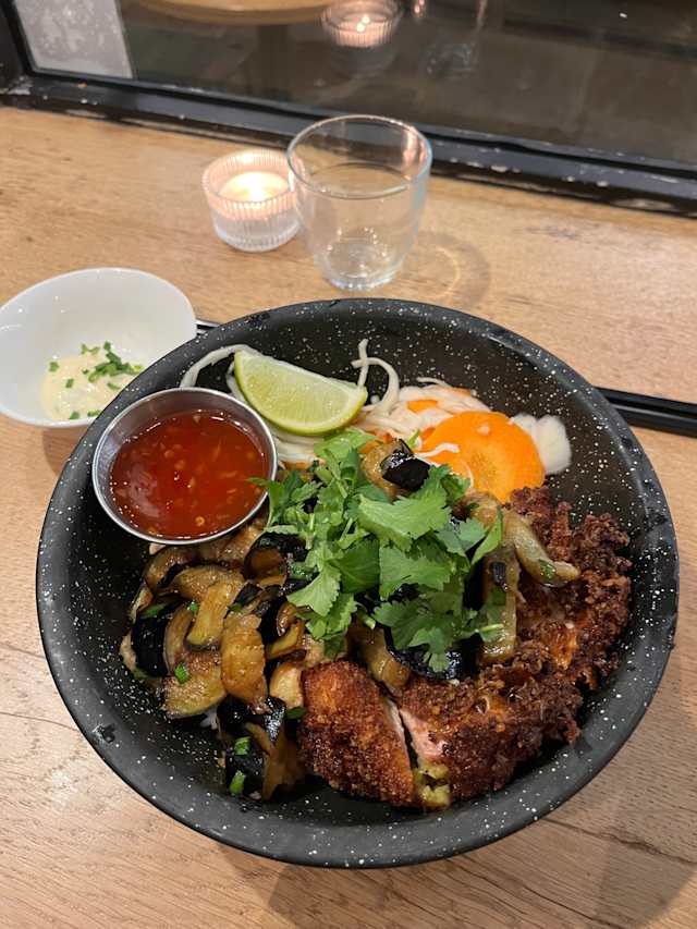 9.5/10Cold summer shrimp rolls, hot tofu balls. Lemongrass sausage with aubergine rice and salad. Delicious organic wines.