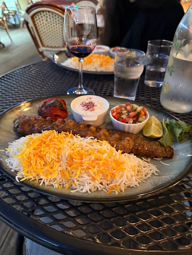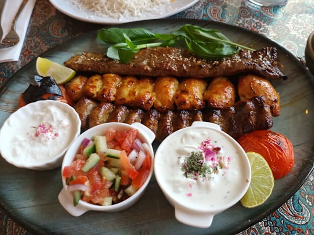 Variation av grillad lamminnerfilé och nöt-lammfärsspett, kycklingsfilé, serveras med mast mosir, sallad shirazi och sa#ranris. Kommer med 3 olika spett för 2 personer