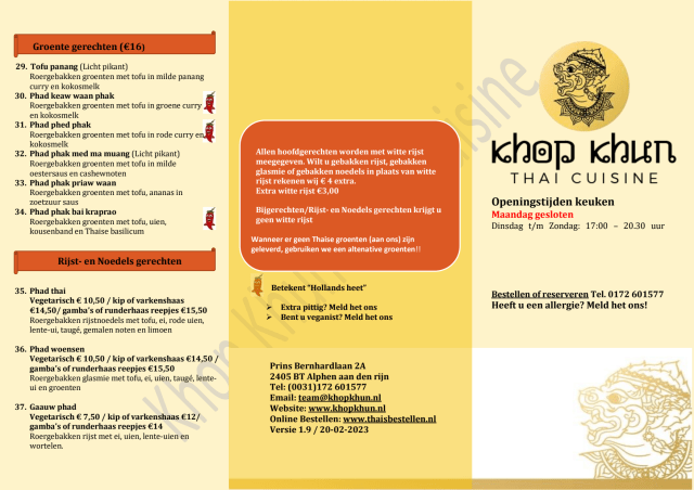 9/10As usual, great food, and love the quiet and family oriented atmosphere.. definitely my favourite thai in Alphen and will be recommending this to more