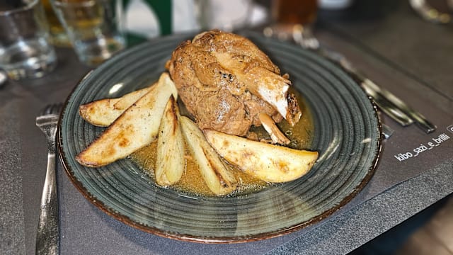 Stinco di suino alpino, in salsa alle erbe, accompagnato da patate al forno