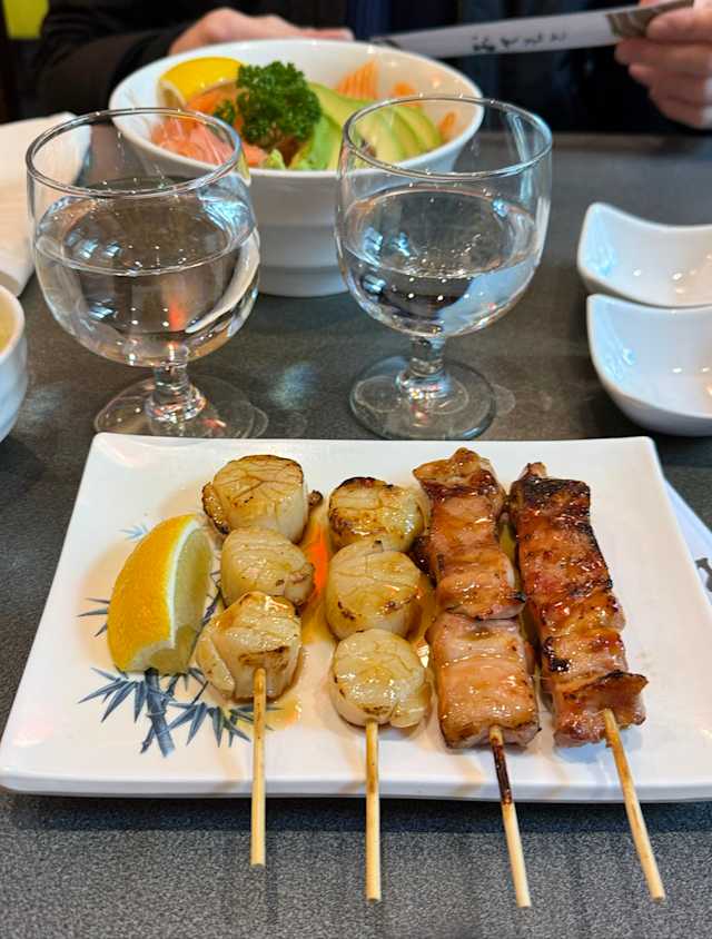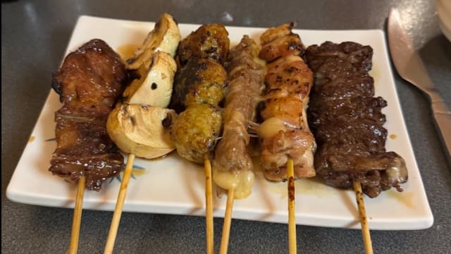 - 4 sushi, 6 sashimi, 6 maki 5 brochettes: boeuf, boulette de poulet, poulet, boeuf au fromage, champignons