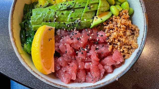 - Saumon cru, avocat, edamame, radis mariné, wakamé, oignon frit, dans un grand bol de riz vinaigré