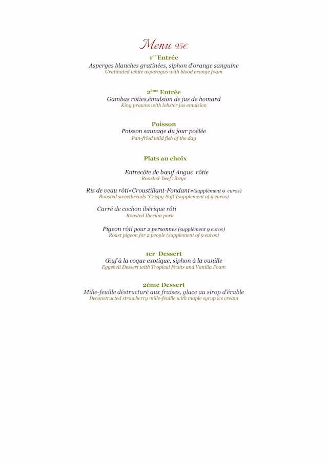 +2Everything was perfect, from the first amuse-bouche to the last bite of dessert. Each course surprised us with elegant, complex flavors. The staff were genuinely kind and professional, and it was such a joy when the chef came out to meet everyone. A beautiful, unforgettable evening. Merci!!!