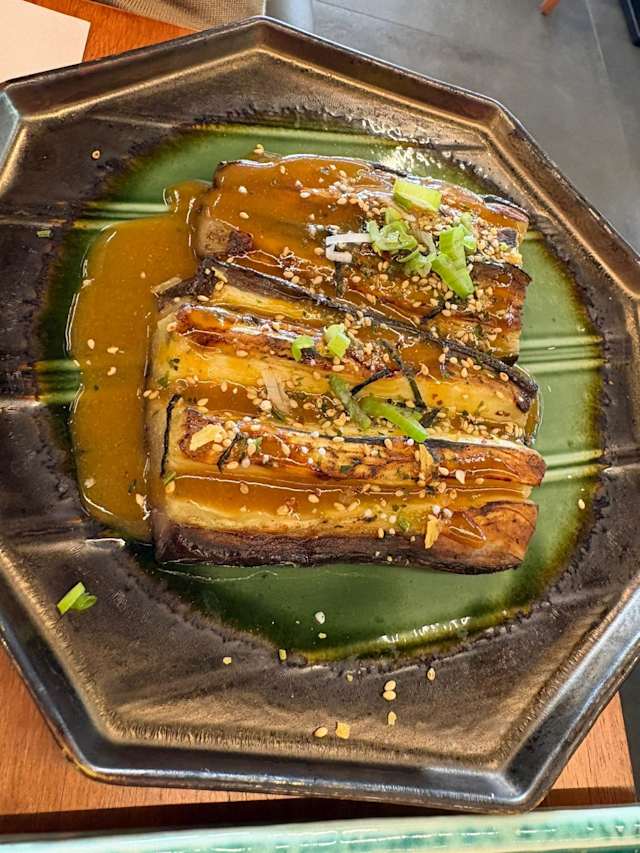 2 spiedini di gnocchi di riso piastrati glassati con salsa mitarashi (caramello di soia)