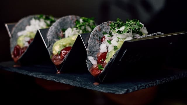 Pescado blanco frito con guacamole, mayo chipotle y col lombarda encurtida