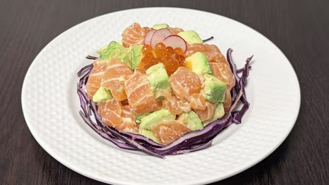 - Thon tataki sauce vinaigré, huile sésame, mangue, oignon rouge coupé en dé, ciboulette, graines de sésames. Accompagné de riz. Accompagnés de riz et de légumes