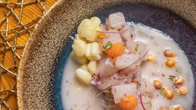 Dadolata di pesce, latte di tigre, chalaquita, mais croccante e patata dolce.