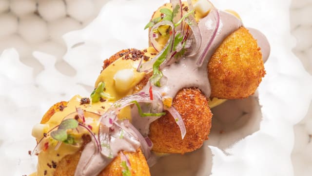 Crocchè di patate farcito con carne di manzo, olive e salsa criolla.