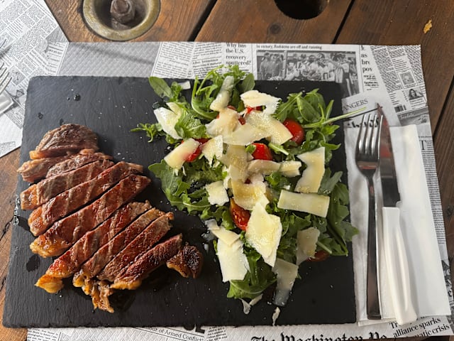 - Insalata verde, rucola, pomodorini, bufala, funghetti e mais con pane tostato