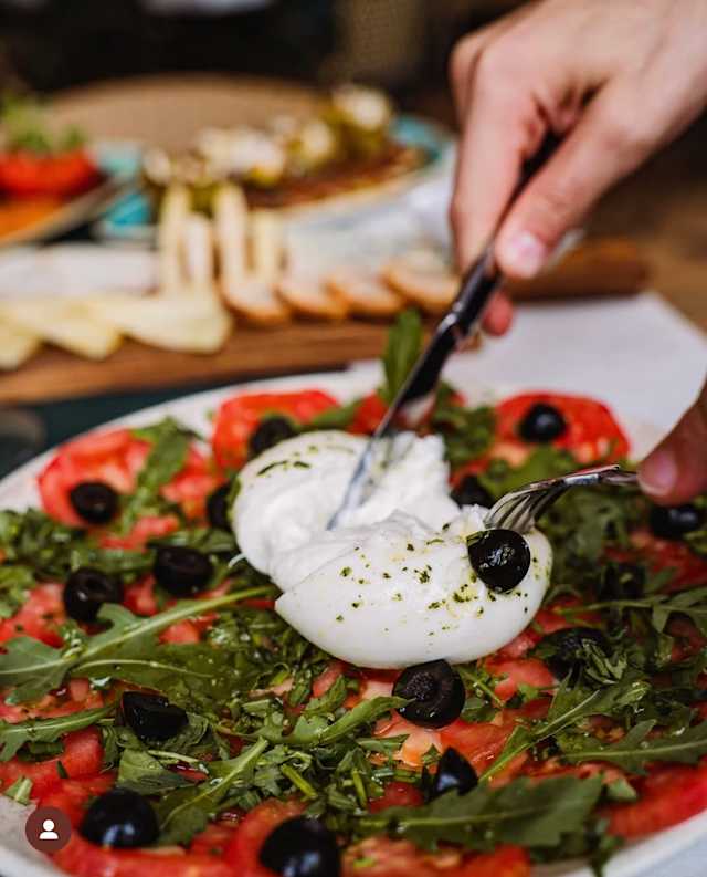 - Burrata con tomate laminado y albahaca