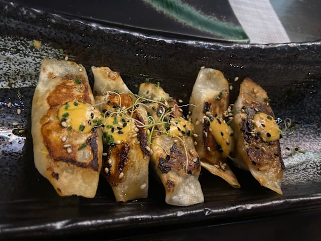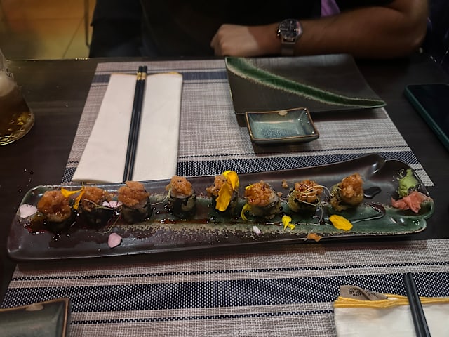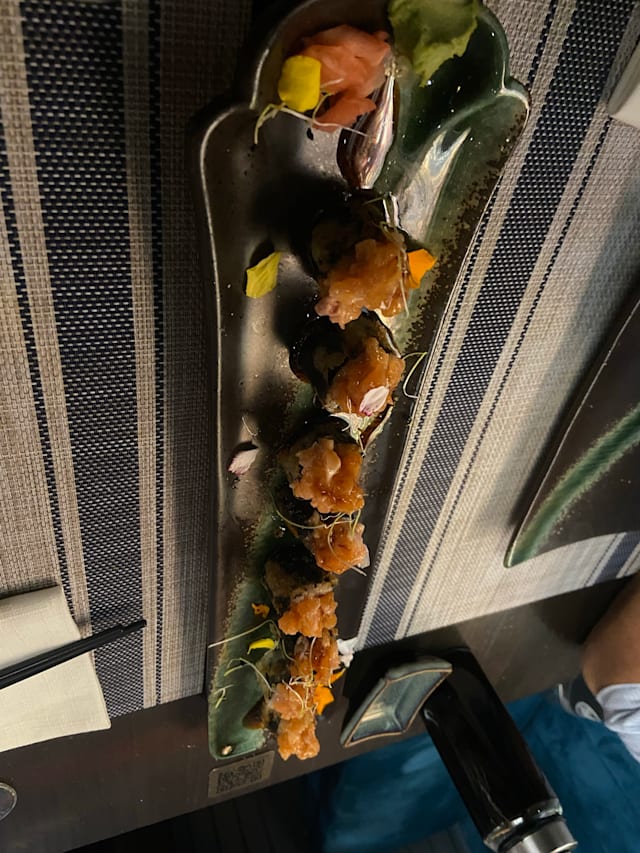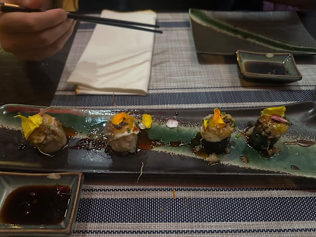 7.5/10Sushi nothing to remember, enjoyed the meat and onion gyozas and specially the gunkans, really good. Having said that it is quite overpriced, each gunkan 7.85€ for a small bite, we ended paying slightly less the 80€ for two people including the 30% less from the Fork. One dish of gyozas, two different dishes of maki and four gunkans. Service attentive, but try to make you order some more.