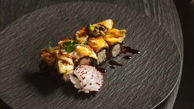 Tartar di salmone e avocado guarnito con tobiko e pomodori secchi con salsa yuzu