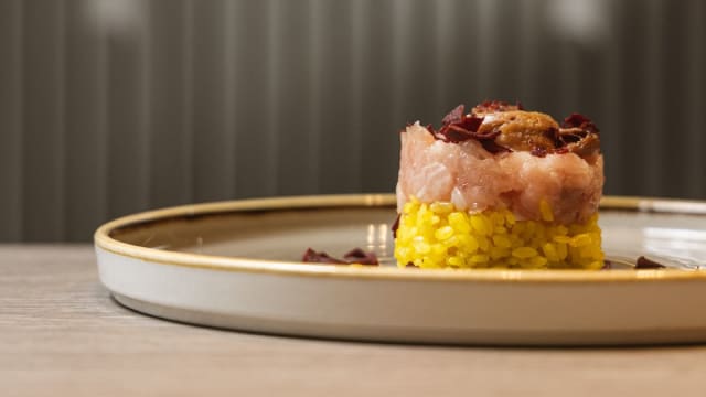 Bocconicino di riso con salmone flambato guarnito con scaglie di pistacchio e salsa yuzu miso