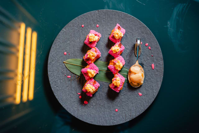 Salmone teriyaki, tartare di gambero crudo, avocado e chips di barbabietola