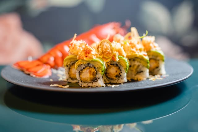 Tempura di gambero, tartare di salmone, philadelphia e Tobiko
