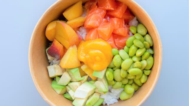 100gr di tartare di salmone marinato al sale dolce di cervia,riso bianco, avocado, edamame, datterino, salsa agrodolce al miele,chutney al mango e semi di zucca