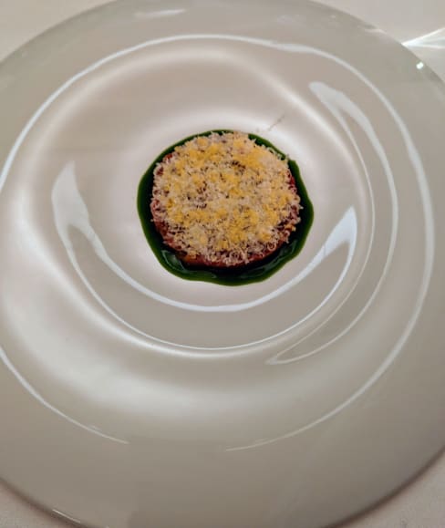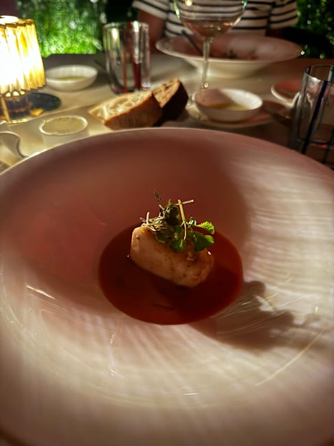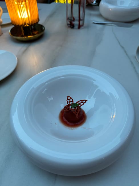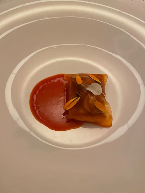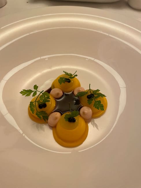 4.5/10Overall not a one star experience. We were served various kinds of bread with Sicilian extra verging oil and salted butter from Normandy – excellent! I then had raw red prawn as appetizer which was good, albeit minuscule. My husband had the chicken terrine with figs and raspberries – excellent again and perhaps the only dish this evening worth a Michelin Star. We both had bbq’d lobster as main dish, which was slightly overdone, with rather bland celery samosas and little carved pears as decoration plus a very ordinary hollandaise that didn’t really match with the lobster sauce. As to their policy they seem to be nudging diners to choose among one of their menus since a la carte portions are the same size as those from the menu. Therefore if you eat a la carte, I would recommend to have at least two starters followed by a primo and a secondo. And a last point: The rather young sommelier should perhaps ask what diners are going to eat before advising them.