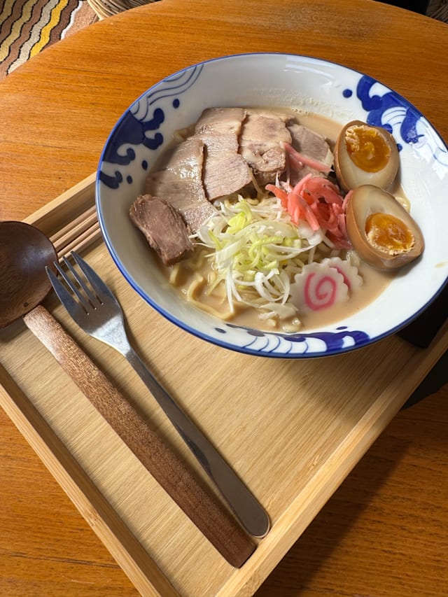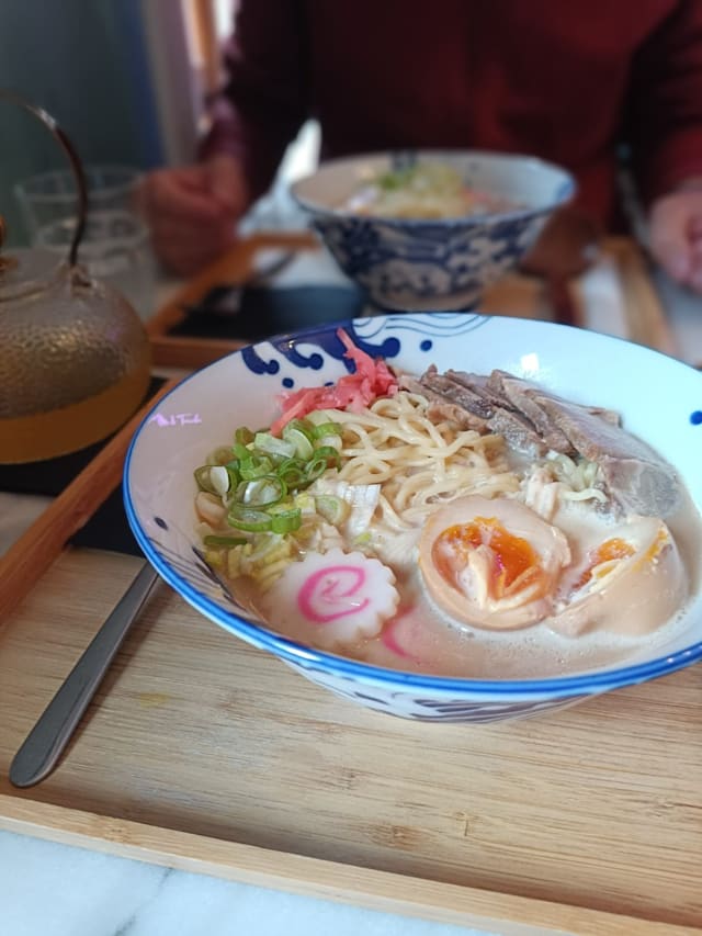 Porc origine france, nouille de blé, oeuf tamago, poireau, gingembre mariné, naruto avec un bouillon à base d’algues et lait de soja.