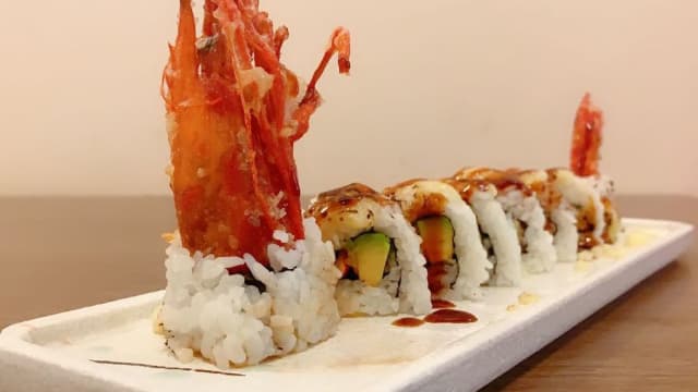 Tempura langostino aguacate envuelto salmon con salsa mayo - mango