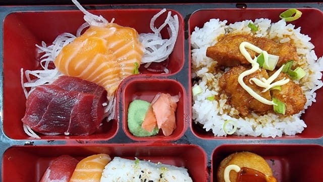 (Salmón agucate cebolla crujiente con mayonesa y teriyaki)
