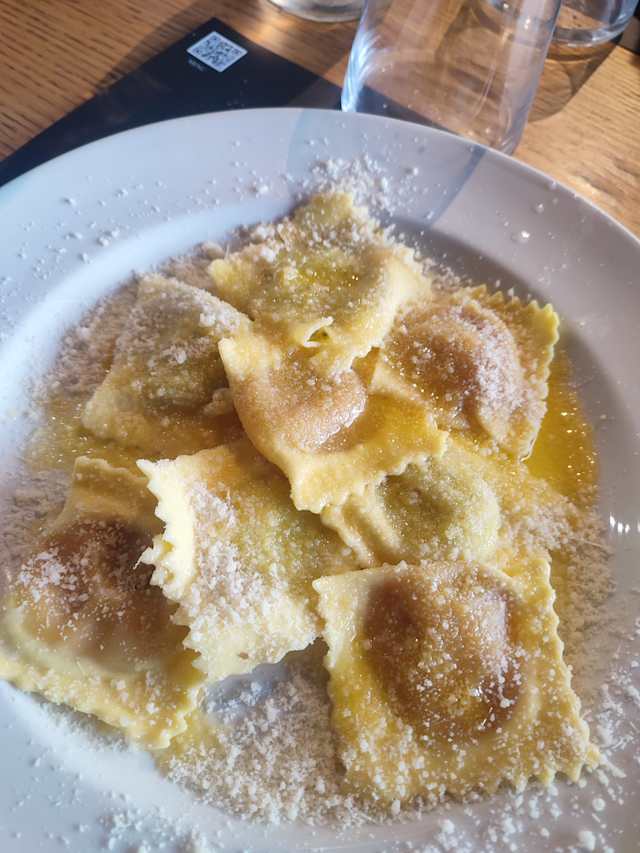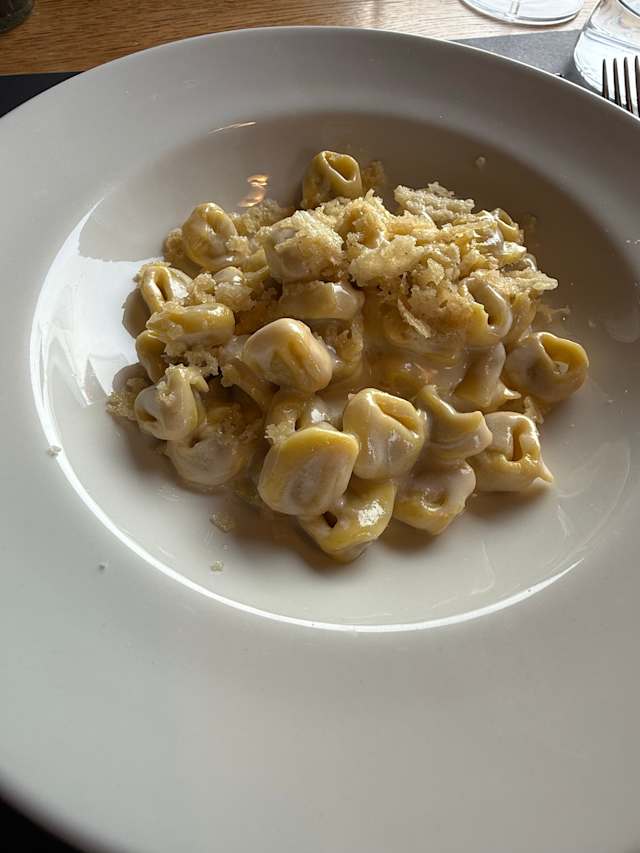 - Bis di tortelli (erbetta e zucca) conditi con burro biologico da latte di vacca rossa reggiana e bruna alpina dell’az. Agricola la villa (urzano - pr) e parmigiano reggiano DOP 24 mesi