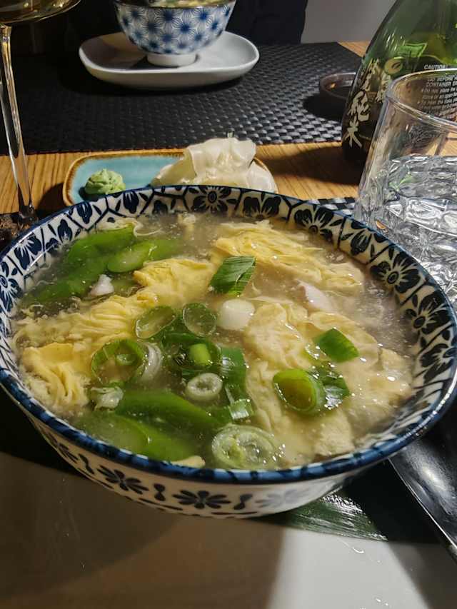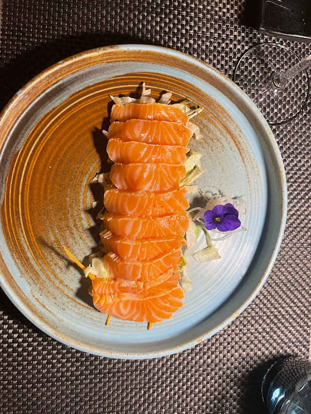 - Carpaccio di salmone scottato a fiamma viva, avocado, edamame, daikon, pesto di zenzero, salsa ponzu, mango