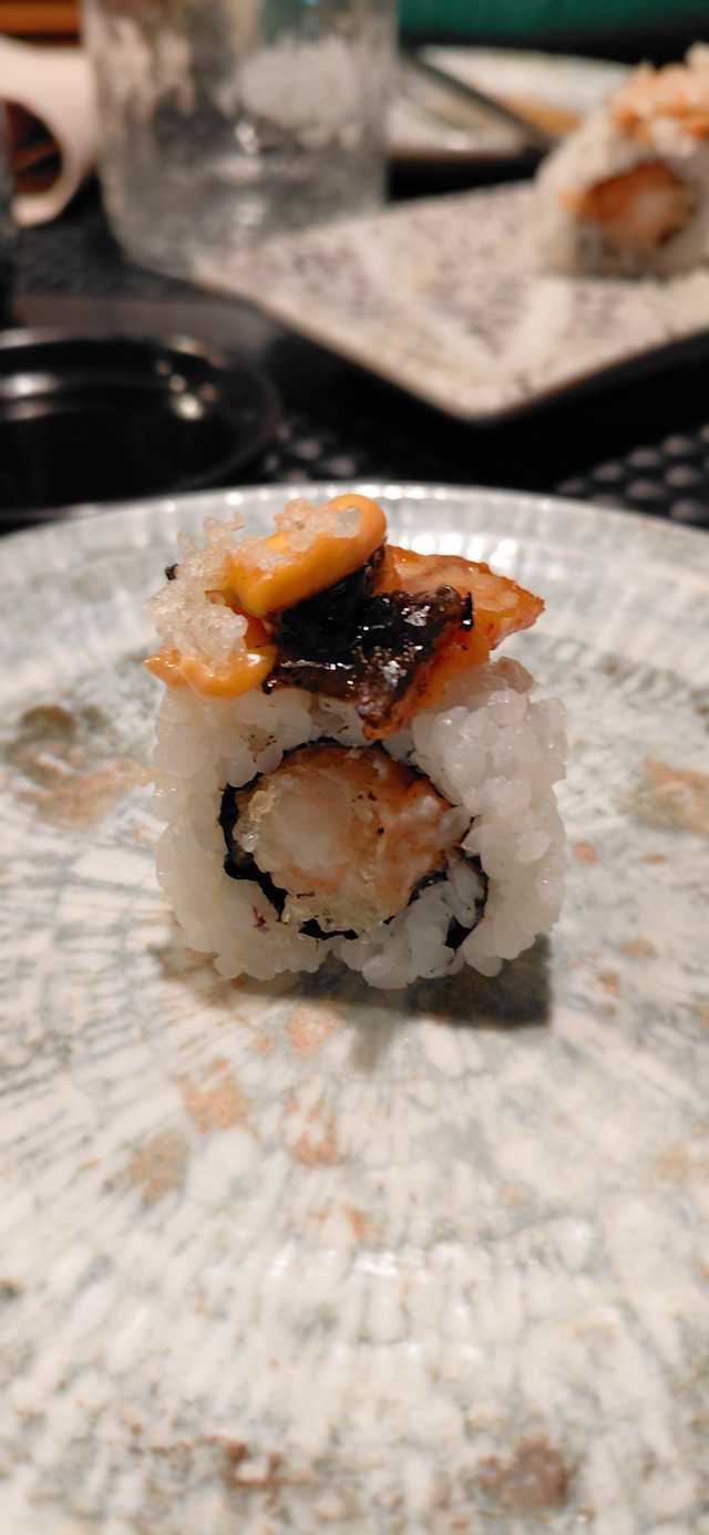 - Salmone, gambero tempurato, anguilla, polvere di tempura, salsa spicy, tobiko
