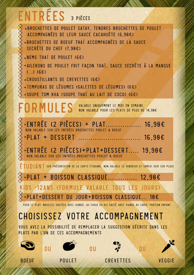 Valable uniquement le midi en semaine. Non valable sur les entrées brochettes poulet & boeuf