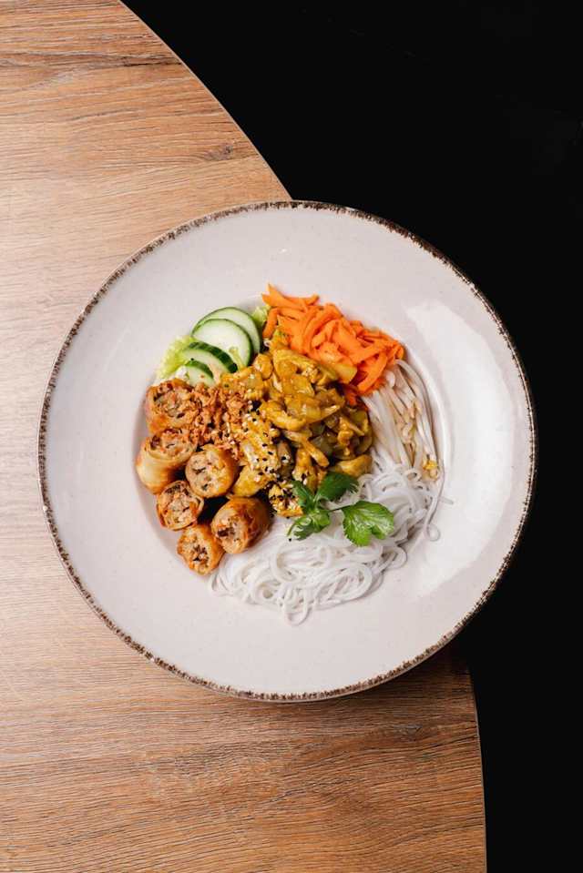 - Salade, nems au poulet ou veggie, boeuf sauté, vermicelles de riz, soja, carotte, concombre, menthe (...)