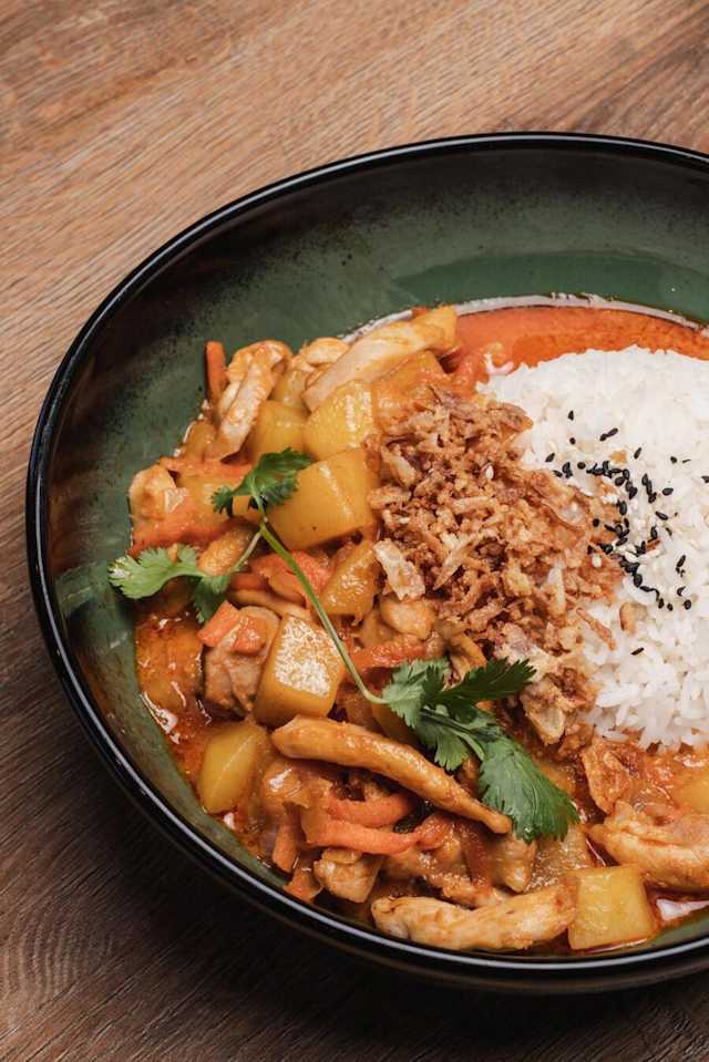 - Boeuf sauté au curry massaman, petits dés de pommes de terre, petits oignons, riz blanc thaï (...)