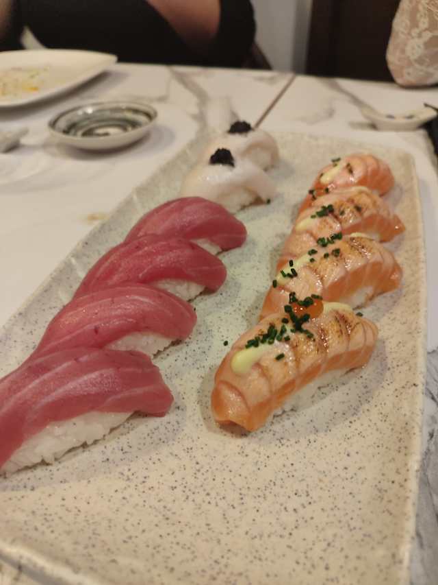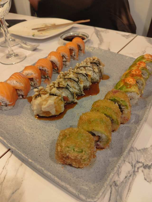 - Salmón flameado con mayonesa japo, langostino tempurizado, aguacate, negi e ikura.