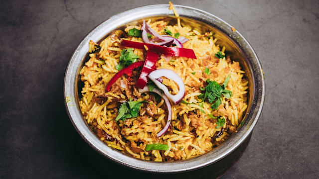 Aubergine bereid met verser specerijen, geserveerd met een yoghurt raitha