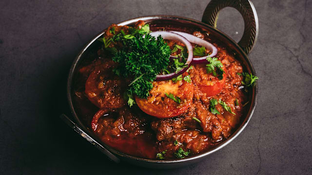 Een medium curry uit Kashmir bereid met gebakken knoflook en verse tomaten
