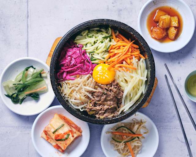 - Bibimbap servi dans un bol en pierre chaud. Au choix : au porc / poulet / bœuf ou tofu
