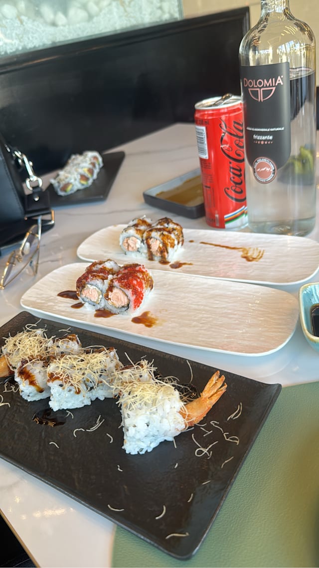 Roll di riso con alghe di soia, salmone alla piastra, gambero, salsa rosa, avocado