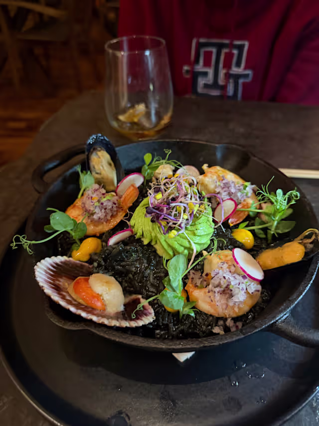 - Arroz en salsa de mariscos y tinta de sepia, mixtura de mariscos, chalaquita al wasabi, alioli de ajo negro, aguacate flameado