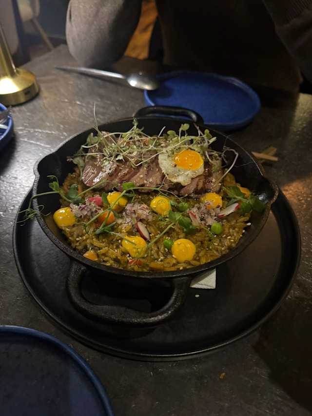 - Shari con cobertura de solomillo, huevo de codorniz montando y coronado con chalaquita ahumada.
