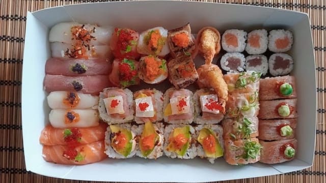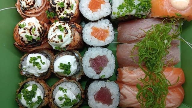 Enrolado de arroz, salmão, alga nori, filadelfia, cebolinha, teriak e sesamo.