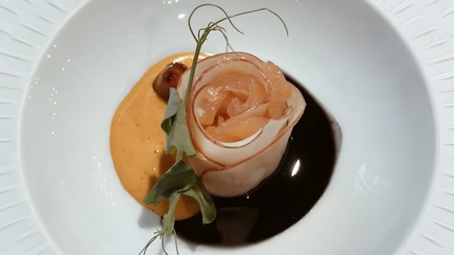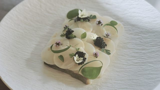 Turbot al pil pil, topinambour, enoki encurtido y praline de avellanas.