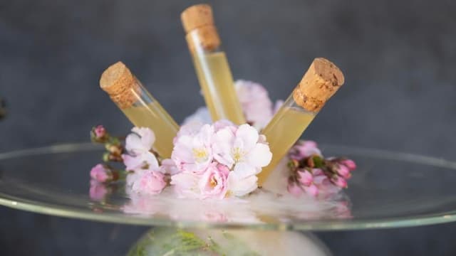 Tartar de remolacha, polvo de nuez, menta, espuma de queso de cabra, sorbete de citrico y aire de remolacha.