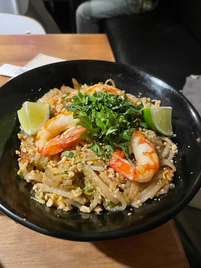 - Fideos de arroz, pollo y gambas salteadas con verduras, salsa de curry katsu, cilantro y limа
