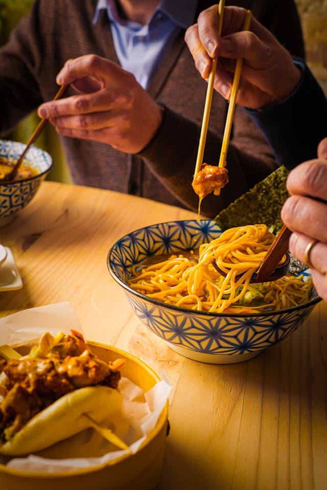 Fideos de arroz, pollo y gambas salteadas con verduras, salsa de curry katsu, cilantro y limа