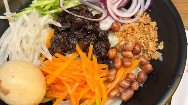 Nouilles de blé fait maison, porc mijoté, concombre, carrot, radis, soja, oignon, cacahuète