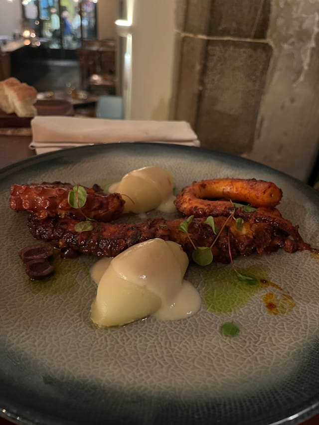 6.5/10Dishes were not really good. Octopus was very fishy which is not normal. In addition the spiciness of the octopus paired really well with the mashed potatoes, but by itself was was not good. Seems it was a lucky match. Tagliolini didn't taste like any of the ingredients. It looked like a spaghetti I could easily do at tome. I'd love to eat the T-bone steak, but 1.3kg minimum, give me a break. I can't eat that much alone. Cut it in 1/2 and more people could enjoy it. 70euros per kg is a bit steep when all you are doing is putting it to grill. No cooking abilities needed for that. So unless you have a special cow that nobody in the world has, or an amazing recipe I call this a tourist trap.