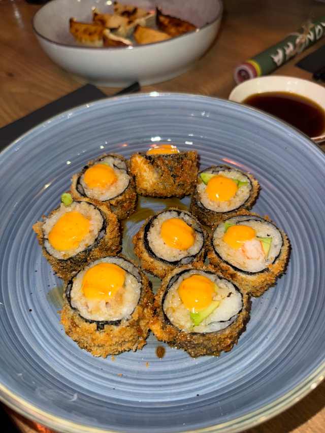 - Tempura crevette, spicy, avocat, tranche de thon rouge, œuf tobikko