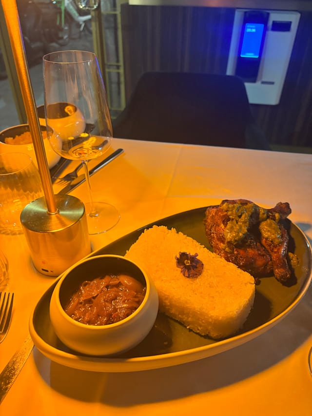 Pollo marinato con lime e spezie, grigliato e servito con salsa di cipolle caramellate accompagnato da profumato riso bianco.